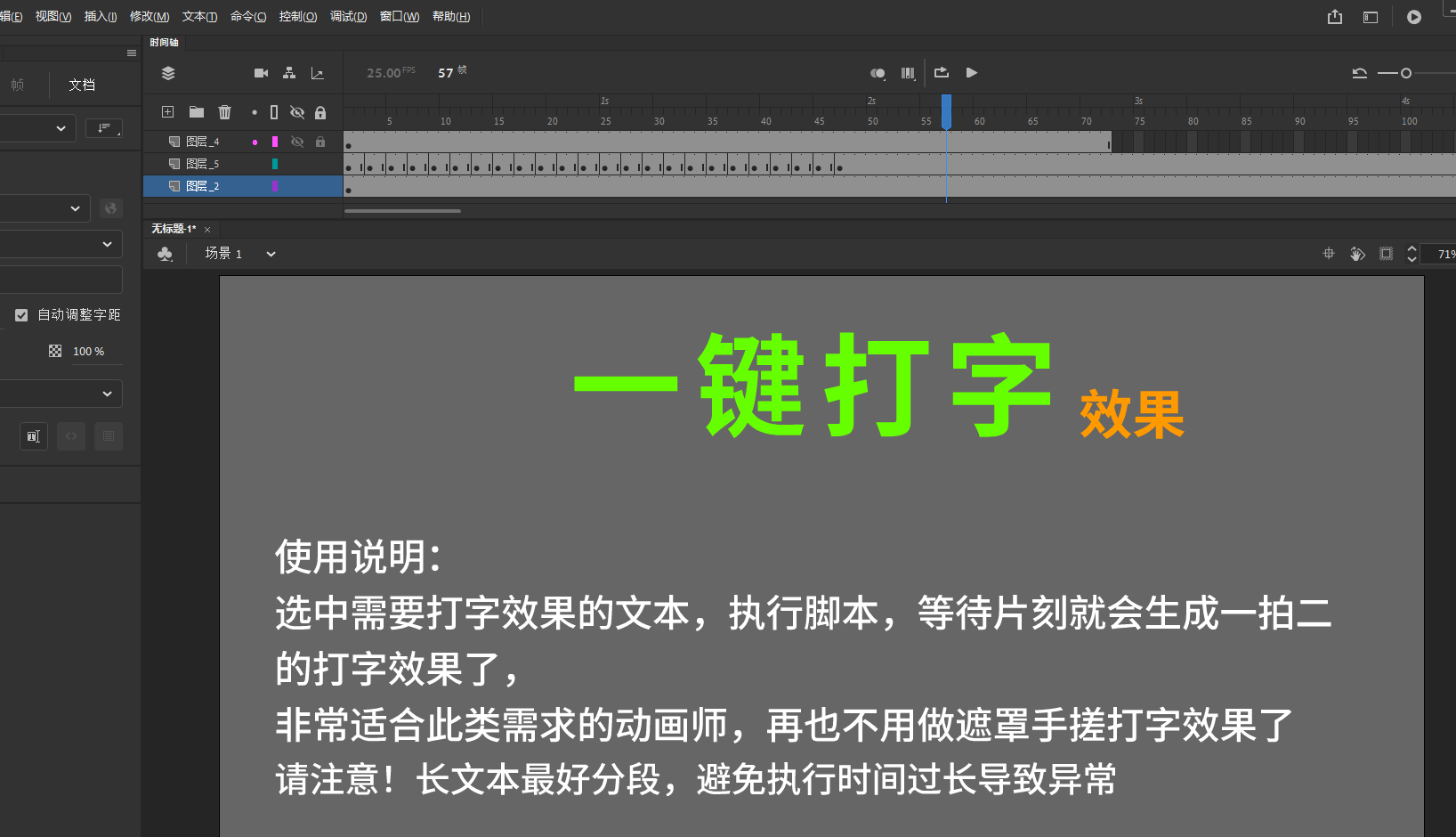二合一命令交替执行添加和删除传统补间,本脚本可以忽略空层、引导层、隐藏层、锁定层,不对其添加补间操作,可设置一个快捷键来代替软件自带的传统补间功能。